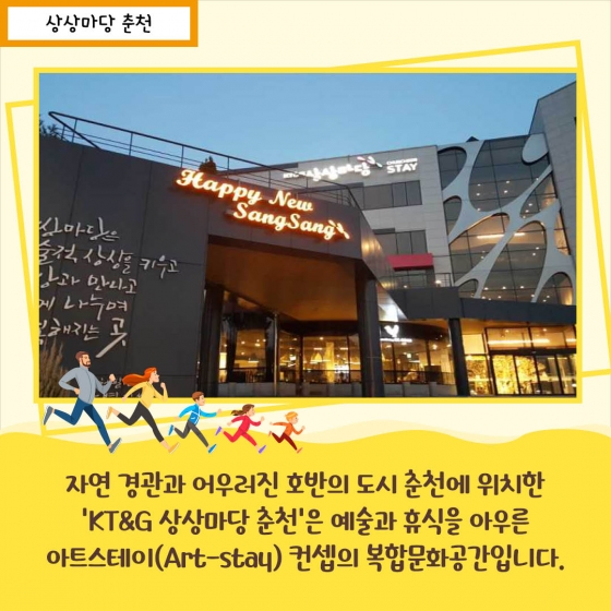 4. ÀÚ¿¬ °æ°ü°ú ¾î¿ì·¯Áø È£¹ÝÀÇ µµ½Ã Ãáõ¿¡ À§Ä¡ÇÑ ¡®KT&G »ó»ó¸¶´ç Ãáõ¡®Àº ¿¹¼ú°ú ÈÞ½ÄÀ» ¾Æ¿ì¸¥ ¾ÆÆ®½ºÅ×ÀÌ(Art-stay) ÄÁ¼ÁÀÇ º¹ÇÕ¹®È°ø°£ÀÔ´Ï´Ù.