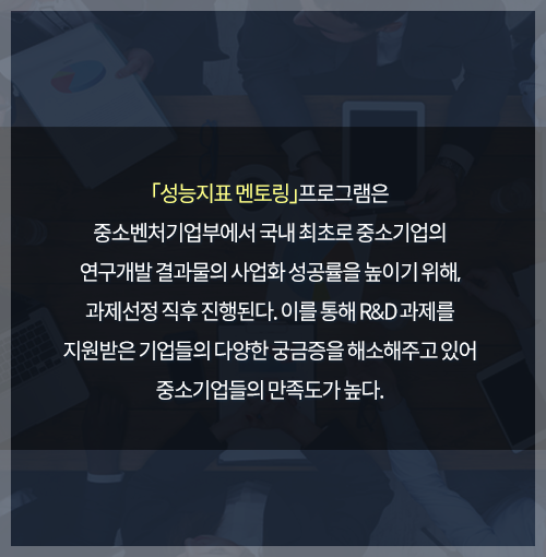 11. ¡¸¼º´ÉÁöÇ¥ ¸àÅ丵¡¹ÇÁ·Î±×·¥Àº Áß¼Òº¥Ã³±â¾÷ºÎ¿¡¼ ±¹³» ÃÖÃÊ·Î Áß¼Ò±â¾÷ÀÇ ¿¬±¸°³¹ß °á°ú¹°ÀÇ »ç¾÷È ¼º°ø·üÀ» ³ôÀ̱â À§ÇØ, °úÁ¦¼±Á¤ Á÷ÈÄ ÁøÇàµÈ´Ù. À̸¦ ÅëÇØ R&D °úÁ¦¸¦ Áö¿ø¹ÞÀº ±â¾÷µéÀÇ ´Ù¾çÇÑ ±Ã±ÝÁõÀ» ÇØ¼ÒÇØÁÖ°í ÀÖ¾î Áß¼Ò±â¾÷µéÀÇ ¸¸Á·µµ°¡ ³ô´Ù.