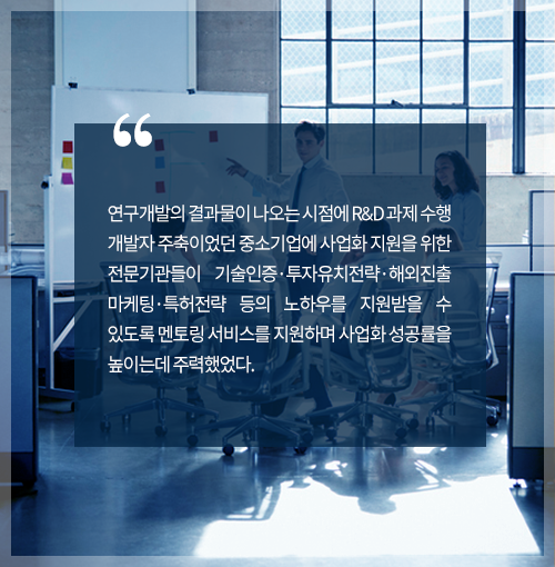 2. ¿¬±¸°³¹ßÀÇ °á°ú¹°ÀÌ ³ª¿À´Â ½ÃÁ¡¿¡ R&D °úÁ¦ ¼öÇà °³¹ßÀÚ ÁÖÃàÀ̾ú´ø Áß¼Ò±â¾÷¿¡ »ç¾÷È Áö¿øÀ» À§ÇÑ Àü¹®±â°üµéÀÌ ±â¼úÀÎÁõ¡¤ÅõÀÚÀ¯Ä¡Àü·«¡¤ÇØ¿ÜÁøÃâ ¸¶ÄÉÆÃ¡¤Æ¯ÇãÀü·« µîÀÇ ³ëÇϿ츦 Áö¿ø¹ÞÀ» ¼ö ÀÖµµ·Ï ¸àÅ丵 ¼ºñ½º¸¦ Áö¿øÇÏ¸ç »ç¾÷È ¼º°ø·üÀ» ³ôÀ̴µ¥ ÁÖ·ÂÇß¾ú´Ù.