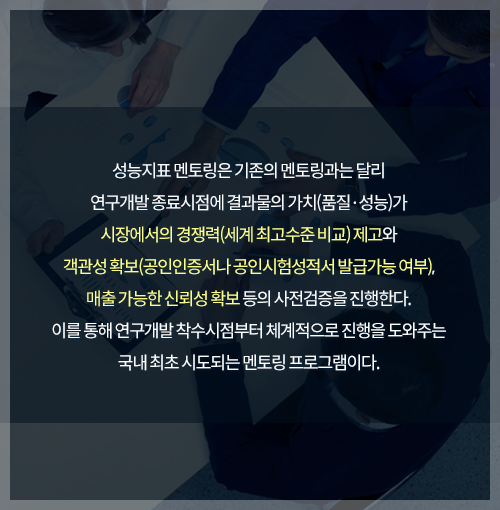 4. ¼º´ÉÁöÇ¥ ¸àÅ丵Àº ±âÁ¸°ú ´Þ¸® ¿¬±¸°³¹ß Á¾·á½ÃÁ¡¿¡ °á°ú¹°ÀÇ °¡Ä¡(ǰÁú¡¤¼º´É)°¡ ½ÃÀå¿¡¼ÀÇ °æÀï·Â(¼¼°è ÃÖ°í¼öÁØ ºñ±³) Á¦°í¿Í °´°ü¼º È®º¸(°øÀÎÀÎÁõ¼³ª °øÀνÃÇ輺Àû¼ ¹ß±Þ°¡´É ¿©ºÎ), ¸ÅÃâ °¡´ÉÇÑ ½Å·Ú¼º È®º¸ µîÀÇ »çÀü°ËÁõÀ» ÁøÇàÇÑ´Ù. À̸¦ ÅëÇØ ¿¬±¸°³¹ß Âø¼ö½ÃÁ¡ºÎÅÍ Ã¼°èÀû ÁøÇàÀ» µµ¿ÍÁÖ´Â ±¹³» ÃÖÃÊ ½ÃµµµÇ´Â ¸àÅ丵 ÇÁ·Î±×·¥ÀÌ´Ù.