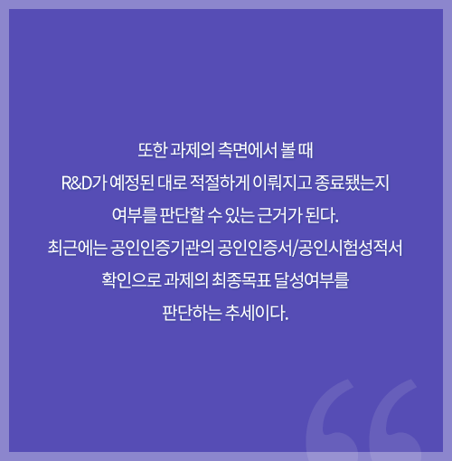6. ¶ÇÇÑ °úÁ¦ÀÇ Ãø¸é¿¡¼ º¼ ¶§ R&D°¡ ¿¹Á¤µÈ ´ë·Î ÀûÀýÇÏ°Ô ÀÌ·ïÁö°í Á¾·áµÆ´ÂÁö ¿©ºÎ¸¦ ÆÇ´ÜÇÒ ¼ö ÀÖ´Â ±Ù°Å°¡ µÈ´Ù. ÃÖ±Ù¿¡´Â °øÀÎÀÎÁõ±â°üÀÇ °øÀÎÀÎÁõ¼/°øÀνÃÇ輺Àû¼ È®ÀÎÀ¸·Î °úÁ¦ÀÇ ÃÖÁ¾¸ñÇ¥ ´Þ¼º¿©ºÎ¸¦ ÆÇ´ÜÇÏ´Â Ãß¼¼ÀÌ´Ù.