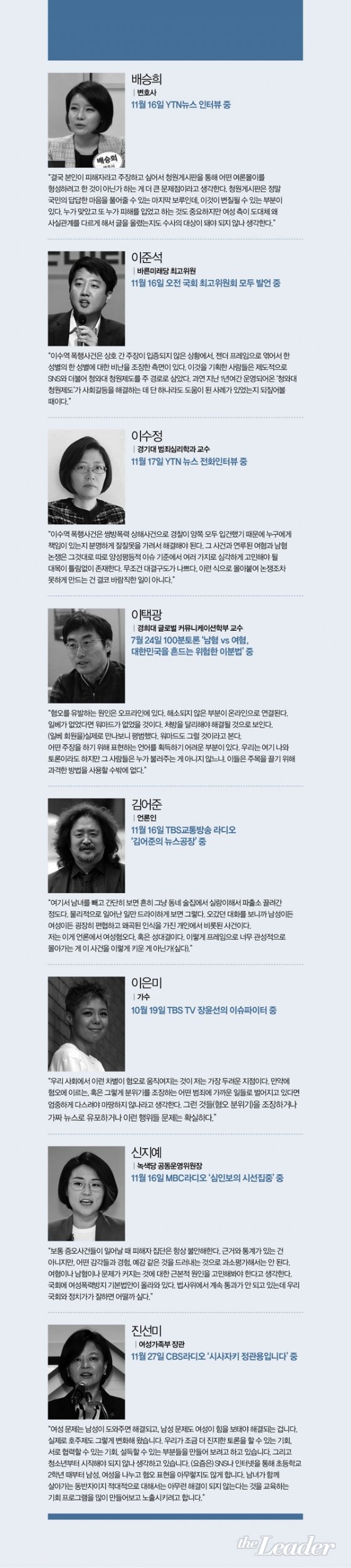 12¿ùÈ£ ¸®´õ½ºÅå¿¡¼´Â ¿©Çø°ú ³²ÇøÀ¸·Î ÀÎÇÑ ¼º°¥µî »çȸ¿¡ ´ëÇÑ °¢°è°¢ÃþÀÇ ¸ñ¼Ò¸®¸¦ µé¾îºÃ´Ù. ÀÌ·± ³í¶õÀº °³²¿ª »ìÀλç°Ç, ¹ÌÅõ¿îµ¿, È«´ë ´©µå¸ðµ¨ ¸ôÄ« »ç°ÇÀ» °ÅÄ¡¸é¼ À̹ø À̼ö¿ª ÆøÇà»ç°Ç¿¡¼ Á¤Á¡À» Âï°í ÀÖ´Ù. ÀϺΠÀü¹®°¡µéÀº ¡°ÀüÅëÀûÀÎ °¡ºÎÀåÀû »çȸ¿¡¼ ¾ç¼ºÆòµî »çȸ·Î °¡´Â °úÁ¤¿¡¼ °ÅÃÄ¾ß ÇÒ ºÎºÐ¡±À̶ó°í À̾߱âÇÑ´Ù. ¿ì¸® »çȸ°¡ ´õ ³ªÀº ¹ßÀüÀ» À§ÇØ °¥µî°ú ³íÀïÀÌ ÇÊ¿äÇÏ´Ù¸é °ø·ÐÈ µîÀ» ÅëÇØ °ÇÀüÇÑ ³íÀǸ¦ ÇØº¼ Çʿ䵵 ÀÖÁö ¾ÊÀ»±î »ý°¢ÇØ¾ß ÇÒ ´ë¸ñÀÌ´Ù.