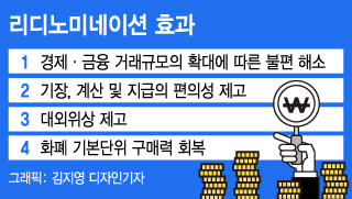 ¸®µð³ë¹Ì³×À̼ÇÀº ¡®´Ù½Ã(Re)¡¯¿Í ¡®ÈÆó¾×¸é ´ÜÀ§ ÀýÇÏ(Denomination)¡¯¸¦ ÇÕÄ£ ´Ü¾î·Î, ÈÆó ¾×¸é°¡¸¦ µ¿ÀÏÇÑ ºñÀ²ÀÇ ³·Àº ¼ýÀÚ·Î ¹Ù²Ù´Â ÀÏÀÌ´Ù. À̸¦Å׸é 10000¿øÀ» 10¿ø, 1000¿øÀ» 1¿ø µîÀ¸·Î º¯°æÇÏ´Â °ÍÀÌ´Ù. ÈÆó°³ÇõÀÇ ÀÏÁ¾À¸·Î ´Ü¼øÈ÷ ´ÜÀ§¸¸ ¹Ù²î±â ¶§¹®¿¡ ÈÆó °¡Ä¡°¡ ¿Ã¶ó°¡°Å³ª ³»·Á°¡Áö ¾Ê´Â´Ù. »õ·Î¿î 1¿øÀº ±âÁ¸ 1000¿øÀÇ °¡Ä¡¸¦ °®°Ô µÈ´Ù.