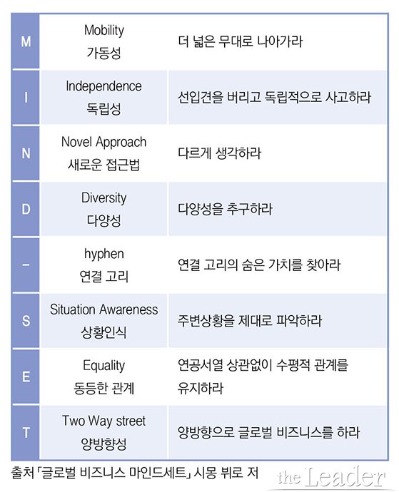 ÀÌ´Â ºñÁî´Ï½º¸ÇµéÀÌ ¾ó¸¶³ª ÀÚÁÖ ¹³¹ÙÀÌ, ·±´ø µîÀ» °¡¼ ÇØ¿Ü°í°´µéÀ» ¸¸³µ´À³ÄÀÇ ¹®Á¦°¡ ¾Æ´Ï´Ù. ¾î¶»°Ô »õ·Î¿î ½ÃÀå¿¡ Á¢±ÙÇÏ°í ¾î¶»°Ô »õ·Î¿î °í°´À» »ó´ëÇÏ´Â °¡ÀÇ ¹®Á¦´Ù. ¹Ù·Î ¸¶Àεå¼Â, Áï »ç°í¹æ½Ä°ú ŵµÀÇ ¹®Á¦¶ó´Â ¾ê±â´Ù. Á¦´ë·Î µÈ ±Û·Î¹ú ¸¶Àεå¼ÂÀ» °¡Áö°í ÀÖ´Ù¸é ¼¼°è½ÃÀå¿¡¼ ºñÁî´Ï½º¸¦ Çϴµ¥ ÀÖ¾î ÈξÀ ¿ëÀÌÇÒ ¼ö ÀÖ´Ù. ´Ù¸¥ ȸ»çº¸´Ù ¾Õ¼ À§Çè¿ä¼Ò¸¦ ÇÇÇÒ ¼ö ÀÖ´Â °ÍÀº ¹°·Ð ³²º¸´Ù ¸ÕÀú ±âȸ¸¦ Æ÷ÂøÇÒ ¼öµµ ÀÖ´Ù. µû¶ó¼ ³»°¡ óÀ½À¸·Î ³½ Ã¥¿¡¼ ÀÌ ±Û·Î¹ú ¸¶Àεå¼ÂÀ̶ó´Â ¸»À» Á¤ÀÇÇÏ·Á°í ³ë·ÂÇß´Ù. MindsetÀ̶ó´Â ´Ü¾î¿¡¼ °¢ ±ÛÀÚÀÇ ¾Õ¸Ó¸®¸¦ µû 8°³ÀÇ ´Ü¾î·Î Á¤ÀÇÇß´Ù.