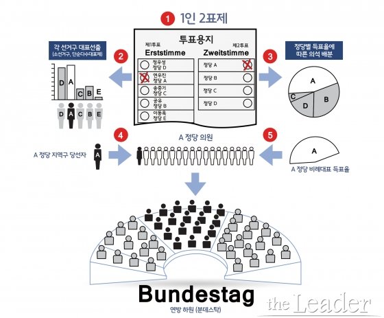 ¼±°Å±ÇÀÚ´Â ÅõÇ¥¿ëÁöÀÇ µÎ °÷¿¡ ±âÇ¥ÇÑ´Ù. ´Ü¼ø ´Ù¼ö´ëÇ¥Á¦·Î ¼±ÃâÇÏ´Â Áö¿ª±¸ Èĺ¸¿¡°Ô ÅõÇ¥ÇÏ´Â °ÍÀº Á¦1ÅõÇ¥(Erststimme)¶ó°í Çϰí, ÀÚ½ÅÀÌ ¼±È£ÇÏ´Â Á¤´ç¿¡ ÅõÇ¥ÇÏ´Â °ÍÀ» Á¦2ÅõÇ¥(Zweitstimme)¶ó°í ÇÑ´Ù. Á¦1ÅõÇ¥¿¡ µû¶ó Áö¿ª±¸¿¡¼ °¡Àå ¸¹Àº Ç¥¸¦ ¾òÀº Èĺ¸ÀÚ°¡ ´ç¼±µÈ´Ù. ¶ÇÇÑ Á¦2ÅõÇ¥ÀÇ µæÇ¥À²¿¡ µû¶ó ¼öÇÐÀû ¹æ½ÄÀ» ÅëÇØ °¢ Á¤´çÀÇ ÃÑ ÀǼ®¼ö°¡ Á¤ÇØÁø´Ù.2)
