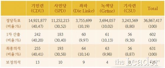 ¶ÇÇÑ ¼Ò¼ö Á¤´çÀÌ ±¹È¸¿¡ ÁøÃâÇÏ±â ¾î·Æ°í ¿ø³» ±³¼·´Üü¸¦ ±¸¼ºÇÏÁö ¸øÇÑ´Ù´Â ¹®Á¦Á¡µµ Á¸ÀçÇÑ´Ù. ÀÌ·¯ÇÑ ¹®Á¦ ÇØ°áÀ» À§ÇØ ¿ì¸®³ª¶ó¿¡¼µµ ±Ç¿ªº° ºñ·Ê´ëÇ¥Á¦¸¦ µµÀÔÇϱâ À§ÇÑ ³íÀǰ¡ Ȱ¹ßÈ÷ ÀÌ·ç¾îÁö°í ÀÖ´Ù. µ¶ÀÏÀÇ ÇÏ¿øÀÇ¿ø ¼±°ÅÁ¦µµ´Â È¥ÇÕÇü ºñ·Ê´ëÇ¥Á¦·Î Á¤´ç µæÇ¥À²¿¡ µû¶ó Á¤´çº° ÀǼ®À» ¹èºÐÇϰí, ´Ü¼ø ´Ù¼ö´ëÇ¥Á¦¸¦ ÅëÇØ °áÁ¤µÈ Áö¿ª±¸ ´ç¼±ÀÚ·Î ¸ÕÀú ÀǼ®À» ä¿î ´ÙÀ½ ÀÜ¿© ÀǼ®À» Á¤´ç ¸íºÎ¿¡ µû¶ó ºñ·Ê´ëÇ¥ ÀÇ¿øÀ¸·Î ä¿ì´Â ¹æ½ÄÀÌ´Ù. ÀÌ´Â ºñ·Ê¼º°ú Áö¿ª ´ëÇ¥¼ºÀ» µ¿½Ã¿¡ È®º¸ÇÒ ¼ö ÀÖ´Â Á¦µµ·Î, Á¤´ç µæÇ¥À²¿¡ µû¶ó ÀǼ®À» Á¤È®È÷ ¹èºÐÇÑ´Ù´Â Á¡¿¡¼ ¿ì¸®¿¡°Ô ¸¹Àº ½Ã»çÁ¡À» ´øÁö°í ÀÖ´Ù. ¾Æ¿ï·¯ ¼Ò¼±°Å±¸Á¦°¡ °¡Áö´Â »çÇ¥ ¹®Á¦¸¦ ÇØ¼ÒÇϰí, Àü¹®¼ºÀ» °®Ãá ÀλçµéÀÌ ÀÇȸ¿¡ ÁøÃâÇÒ ¼ö ÀÖ´Â ±âȸ¸¦ ºÎ¿©Çϰí ÀÖ´Ù. 1982³âºÎÅÍ 1998³â±îÁö 16³â°£ ÃÖÀå±â°£ µ¶ÀÏ ¿¬¹æ ÃѸ®·Î ÀçÀÓÇϸç, 1990³â µ¶ÀÏ ÅëÀÏ¿¡ Áö´ëÇÑ °øÀ» ¼¼¿î Ç﹫Ʈ ÄÝÀÌ Áö³ 6¿ù 16ÀÏ 87¼¼ÀÇ Àϱâ·Î ¼¼»óÀ» ¶°³µ´Ù. ¿À´Â 9¿ù 24ÀÏ Ä¡·¯Áö´Â µ¶ÀÏ ÃѼ±¿¡¼ µ¶ÀÏ ±¹¹ÎµéÀÇ Ç¥½ÉÀÌ ¾îµð·Î ÇâÇϴ°¡¿¡ µû¶ó ÇöÀç µ¶ÀÏ ÃѸ®Á÷À» ¼öÇàÇϰí ÀÖ´Â ¾Ó°Ö¶ó ¸Þ¸£ÄÌÀÌ Ç﹫Ʈ ÄÝ Àü ÃѸ®¿¡ À̾î ÃÖÀå±â°£ µ¶ÀÏÀÇ ÃѸ®·Î ÀçÀÓÇÒ ¼ö ÀÖÀ»Áö°¡ °áÁ¤µÈ´Ù. ´Ùº¯ÈÇÏ´Â ±¹Á¦Á¤¼¼ ¼Ó¿¡ µ¶ÀÏ ÃѼ±¿¡ ¼¼°èÀÇ ´«ÀÌ ÁýÁߵǰí ÀÖ´Ù.