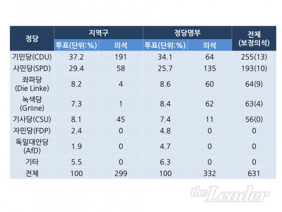 Àü ¼¼°è°¡ ÁÖ¸ñÇÏ´Â µ¶ÀÏ ÃѼ±ÀÌ ¿À´Â 9¿ù 24ÀÏ ½Ç½ÃµÈ´Ù. ¿¬¹æÇÏ¿ø ÀÇ¿øÀ» ¼±ÃâÇÏ´Â µ¶ÀÏ ÃѼ±Àº 1ÀÎ 2Ç¥Á¦ÀÌ´Ù. Á¦1ÅõÇ¥´Â Áö¿ª±¸ ÀÇ¿øÀ» ¼±ÃâÇÏ´Â ´Ü¼ø´Ù¼ö´ëÇ¥Á¦ Á÷Á¢¼±°Å¹æ½ÄÀ¸·Î¼ °¢ Áö¿ª±¸¿¡¼ °¡Àå ¸¹Àº Ç¥¸¦ ¾òÀº Èĺ¸ÀÚ°¡ ´ç¼±µÈ´Ù. Áö¿ª±¸¿¡¼´Â ÃÑ 299¸íÀÇ ÀÇ¿øÀÌ ¼±ÃâµÈ´Ù. Á¦2ÅõÇ¥´Â ¼±È£Á¤´çÀ» ÅõÇ¥ÇÏ´Â ºñ·Ê´ëÇ¥Á¦ ¹æ½ÄÀ¸·Î ½Ç½ÃµÇ¾î Á¦2ÅõÇ¥ÀÇ µæÇ¥À²¿¡ µû¶ó °¢ Á¤´çÀÇ ÃÑ ÀǼ®¼ö°¡ Á¤ÇØÁø´Ù. Á¦2ÅõÇ¥ °á°ú¿¡ µû¶ó °¢ ÁÖ¿¡ ¹èÁ¤µÈ ÀǼ®¼ö¿¡¼ Áö¿ª±¸ ´ç¼±ÀÚ¸¦ »« ÀÜ¿© ÀǼ®À» Á¤´ç ¸íºÎ ¼øÀ¸·Î ºñ·Ê´ëÇ¥Èĺ¸¿¡°Ô ÇÒ´çÇÑ´Ù. ÀÌ °úÁ¤¿¡¼ Áö¿ª±¸¿¡ ¹èÁ¤µÈ ÀǼ®¼ö º¸´Ù ¸¹Àº ´ç¼±ÀÚ°¡ ¹ß»ýÇÏ´õ¶óµµ ¸ðµÎ ´ç¼±ÀÚ·Î °áÁ¤µÇ±â ¶§¹®¿¡ µ¶ÀÏ ¿¬¹æÇÏ¿øÀº Á¤¿ø 598¸íÀ» ÃʰúÇÒ ¼ö ÀÖ´Ù. ÀÌ °æ¿ì, º¸Á¤ÀǼ®À» ÅëÇØ Á¤´çº°·Î ÀǼ®À» ´õ ¹èÁ¤ÇÏ¿© °¢ ´çÀÇ ÃÖÁ¾ÀǼ®¼ö°¡ ƯǥÀ²¿¡ ÃÖ´ëÇÑ ±ÙÁ¢Çϵµ·Ï Á¶Á¤ÇÑ´Ù.