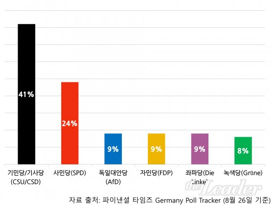 µ¶ÀÏ ÃѸ®´Â Åë»ó °¡Àå ¸¹Àº ÀǼ®À» ¾òÀº Á¤´çÀÇ ´ç¼ö°¡ ¸Ã´Â´Ù. 2017³â µ¶ÀÏ ÃѼ±Àº ±â¹Î´ç/±â»ç´ç ¿¬ÇÕÀÇ ¾Ó°Ö¶ó ¸Þ¸£ÄÌ(Angela Merkel) ÃѸ®¿Í »ç¹Î´ç(SPD) ´ç¼ö ¸¶Æ¾ ½¶Ã÷(Martin Schulz)ÀÇ ´ë°áÀÌ µÉ ¿¹Á¤ÀÌ´Ù. 2013³â ÃѼ±¿¡¼´Â ±âµ¶¹ÎÁÖ´ç(CDU)/±âµ¶»çȸ´ç(CSU) ¿¬ÇÕ°ú »çȸ¹ÎÁÖ´ç(SPD)ÀÌ ¿¬Á¤À» ÀÌ·ç¾î ±¹Á¤À» À̲ø¾î¿Ô´Ù. ±â¹Î´ç ´ç¼ö ¾Ó°Ö¶ó ¸Þ¸£ÄÌ ÃѸ®´Â 2013³â ÃѼ±À¸·Î 3¿¬ÀÓ¿¡ ¼º°øÇÏ¿´À¸¸ç, 2016³â 12¿ù ±â¹Î´ç Àü´ç´ëȸ¿¡¼ ´ç¼öÁ÷ Àç¼±¿¡ ¼º°øÇÏ¸é¼ 2017³â ÃѼ±¿¡¼µµ ÃѸ®Á÷ ¿¬ÀÓ¿¡ µµÀüÇÏ°Ô µÇ¾ú´Ù. ¸¸¾à ±â¹Î´ç/±â»ç´ç ¿¬ÇÕÀÌ À̹ø ÃѼ±¿¡¼ ÀÌ°Ü ¸Þ¸£ÄÌ ÃѸ®°¡ 4¿¬ÀÓ¿¡ ¼º°øÇÑ´Ù¸é ¸Þ¸£ÄÌ ÃѸ® ÀçÀÓ ±â°£Àº Ç﹫Ʈ ÄÝ(Helmut Kohl) ÃѸ®ÀÇ ¿ª´ë ÃÖÀå¼ö 16³â ÃѸ® ÀçÀÓ ±â·Ï°ú ¾î±ú¸¦ ³ª¶õÈ÷ ÇÏ°Ô µÈ´Ù.