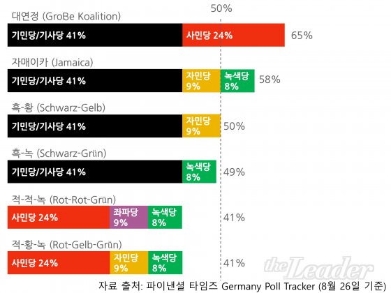 ¿©·ÐÁ¶»ç ¿¹Ãø´ë·Î ¸Þ¸£ÄÌ ÃѸ®°¡ ¹«³ÇÏ°Ô ½Â¸®ÇÒ °æ¿ì ¿¬Á¤ ±¸¼º ¹æ½Äµµ ÀïÁ¡À¸·Î ¶°¿À¸£°í ÀÖ´Ù. ÀÇ¿ø³»°¢Á¦¸¦ ÅÃÇÏ´Â µ¶ÀÏÀº ÃÖ´ÙÁöÁöÀ²À» ¾òÀº Á¤´çÀÌ °ú¹ÝÀ» Â÷ÁöÇÏÁö ¸øÇÒ °æ¿ì ¿¬Á¤À» ÅëÇØ ³»°¢À» ÀÌ·ç¾î¾ß ÇÑ´Ù. ÃѼ±À» ¾ÕµÎ°í »ç¹Î´çÀÌ ½¶Ã÷¸¦ ÃѸ® È帷ΠÃß´ëÇÏ¸ç ¸Þ¸£ÄÌ ÃѸ®¿Í ½Å°æÀüÀ» ¹úÀ̰í ÀÖÀ¸¹Ç·Î ±âµ¶¹ÎÁÖ´çÀÌ ÀçÁý±Ç¿¡ ¼º°øÇÒ °æ¿ì »ç¹Î´çÀº ¿¬Á¤¿¡¼ ÀÌÅ»ÇÒ °¡´É¼ºÀÌ ÀÖ´Ù. µû¶ó¼ ±â¹Î´ç/±â»ç´ç ¿¬ÇÕÀº 8~9%ÀÇ ÁöÁöÀ²À» °®°í ÀÖ´Â ±º¼ÒÁ¤´çÀÎ ÀÚÀ¯¹ÎÁÖ´ç(FDP) ¹× ³ì»ö´ç(Bündnis 90/Die Grünen)°ú ¿¬¸³ÇÒ °¡´É¼ºÀÌ ÀÖ´Ù. ÀÌ·¯ÇÑ ÇüÅÂÀÇ ¿¬Á¤ °¡´É¼ºÀº ¼¼ Á¤´çÀÇ »ó¡»ö(°ËÀº»ö, ³ë¶õ»ö, ÃÊ·Ï»ö)À» µû 'ÀÚ¸ÅÀÌÄ« ¿¬Á¤(Jamaica coalition)'À̶ó°í ºÒ¸®±âµµ ÇÑ´Ù.(8) ±×·¯³ª ÀÌÀüó·³ ±â¹Î´ç/±â»ç´ç ¿¬ÇÕ°ú »ç¹Î´çÀÌ ´ë¿¬Á¤À¸·Î Àç°áÇÕÇÒ °¡´É¼ºµµ ¹èÁ¦ÇÒ ¼ö ¾ø´Ù. ¸¸¾à ¿¹»óÀ» µÚ¾þ°í »ç¹Î´çÀÌ Áý±Ç¿¡ ¼º°øÇÏ°Ô µÇ¸é Àϸí 'ÀûÀû³ì(Rot-Rot-Grün) ¿¬Á¤', Áï »ç¹Î´çÀÌ ÁÂÆÄ´ç(Die Linke)°ú ³ì»ö´ç°ú ¿¬Á¤À» ÀÌ·ç´Â »óȲÀÎ ¡®´ëÁÂÆÄ¿¬Á¤' °¡´É¼ºµµ ¾ð±ÞµÇ°í ÀÖÀ¸³ª, Àü ¼¼°èÀûÀ¸·Î ¾Èº¸Á¤Ã¥ °È¿Í À̹ÎÀÚ¼ö¿ëÁ¦ÇÑ µî º¸¼öÀû °æÇâÀÇ Á¤Ã¥ÀÌ ´õ Àα⸦ ¾ò°í ÀÖ´Â ½ÃÁ¡¿¡¼ ¡®´ëÁÂÆÄ¿¬Á¤¡¯Àº ½±Áö ¾ÊÀ» °ÍÀ¸·Î ¿¹ÃøµÈ´Ù. µû¶ó¼ »ç¹Î´çÀÌ ÃÖ´ÙÁöÁöÀ²À» ȹµæÇÏ´õ¶óµµ ÇöÀç¿Í °°ÀÌ ±â¹Î´ç/±â»ç´ç°ú ¿¬Á¤À» ÀÌ·ê °ÍÀ̶ó´Â Àü¸ÁÀÌ Á¦±âµÇ°í ÀÖ´Ù.