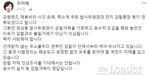 À̹ø ³í¶õÀº Áö³ÇØ 2¿ù °¿ø·£µå ä¿ë ºñ¸®¸¦ ¼ö»çÇß´ø ¾È¹ÌÇö °Ë»ç°¡ Áö³ 4ÀÏ MBC¿ÍÀÇ ÀÎÅͺ信¼ ÃÖÁ¾¿ø ´ç½Ã ÃáõÁö°ËÀå¿¡°Ô °©Àڱ⠼ö»ç¸¦ Á¶±â Á¾°áÇ϶ó´Â ºÎ´ç ¾Ð·ÂÀ» ¹Þ¾Ò´Ù°í ÁÖÀåÇÏ¸é¼ ÀçÁ¡È µÆ´Ù. ¾È °Ë»ç´Â ±Ç À§¿øÀå°ú ¸ð ÀüÁ÷ °í°ËÀå, ÃÖ Àü »çÀå Ãø±Ù »çÀÌ¿¡ ¿©·¯ ¹ø ¿¬¶ôÀÌ ¿À°£ Á¤È²¿¡ ºñÃç ÇØ´ç °í°ËÀå°ú ±Ç À§¿øÀåÀÌ °³ÀÔµÈ °ÍÀÌ ¾Æ´ÑÁö ÀǽÉÇÏ°Ô µÆ´Ù°í ¹àÇû´Ù.