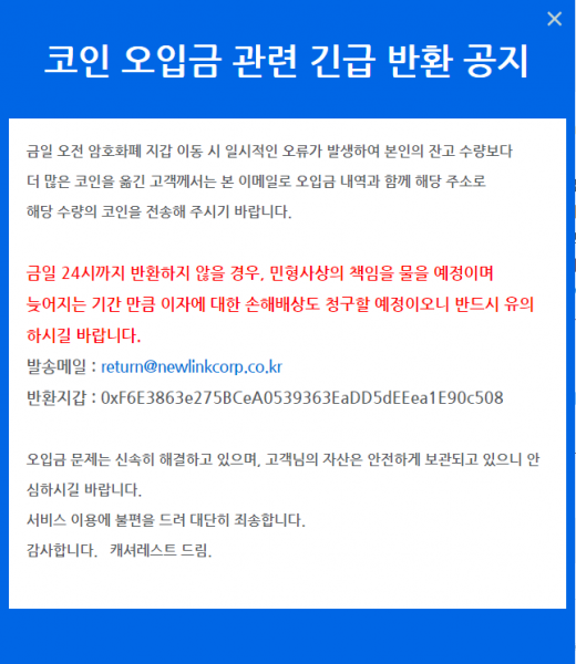 °¡»óÅëÈ °Å·¡»çÀÌÆ® ij¼Å·¹½ºÆ®´Â 20ÀÏ "±ÝÀÏ ¿ÀÀü ¾ÏÈ£ÈÆó Áö°© À̵¿½Ã ÀϽÃÀûÀÎ ¿À·ù°¡ ¹ß»ýÇß´Ù"¸ç "º»ÀÎÀÇ ÀÜ°í ¼ö·®º¸´Ù ´õ ¸¹Àº ÄÚÀÎÀ» ¿Å±ä °í°´Àº ¿ÀÀÔ±ÝµÈ ³»¿ª°ú ÇÔ²² ÄÚÀÎÀ» ȸ»çÃø ¹ÝȯÁö°©À¸·Î º¸³¾ °Í"À» °øÁöÇß´Ù.