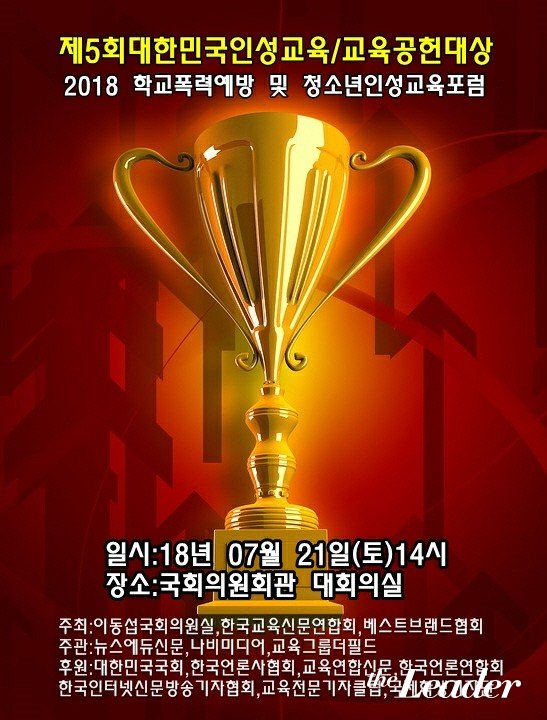 Çб³Æø·Â¿¹¹æ ¹× Àμº±³À° ¼¼¹Ì³ª¿Í Á¦ 5ȸ ¡®2018 ´ëÇѹα¹Àμº±³À°´ë»ó(Korea Character Education Awards 2017) & ´ëÇѹα¹±³À°°øÇå´ë»ó(Korea Education Contribution Awards 2018)¡¯ ±Û·Î¹ú ±³À°ºê·£µå&Àι°´ë»ó ½Ã»ó½ÄÀÌ ¿À´Â 7¿ù 21ÀÏ(Åä) ¿ÀÈÄ 2½Ã ±¹È¸ÀÇ¿øÈ¸°ü ´ëȸÀǽǿ¡¼ °³ÃֵȴÙ.