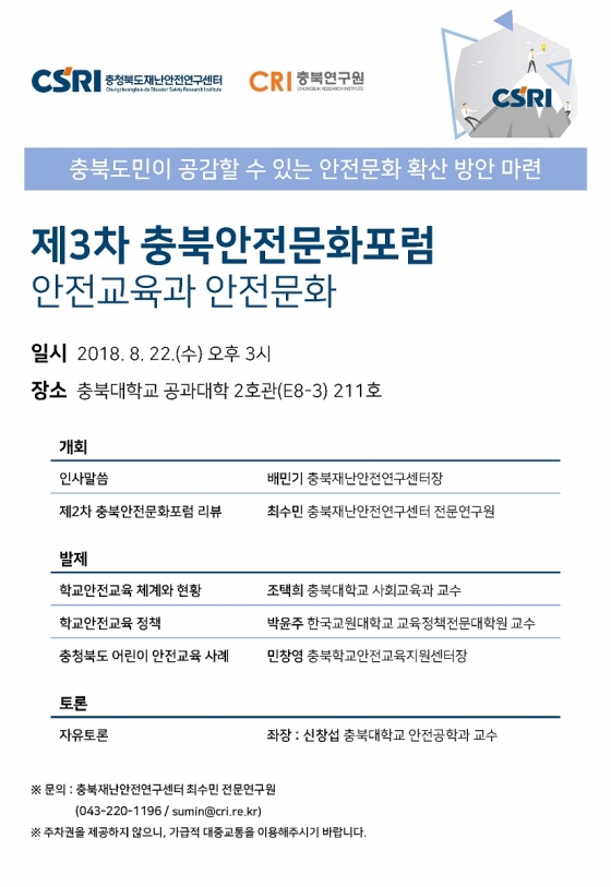 8¿ù 22ÀÏ ¿ÀÈÄ 3½ÃºÎÅÍ ÃæºÏ´ëÇб³ °ø°ú´ëÇÐ(E8-3µ¿ 211È£)¿¡¼ ÁøÇàµÉ ÀÌ Æ÷·³¿¡´Â ÃæºÏµµÃ» ¹× ±³À°Ã»ÀÇ °ü°èÀÚ¸¦ Æ÷ÇÔÇÑ 20¿©¸íÀÇ ¾ÈÀü¹®È ºÐ¾ß(±³À°, Á¤Ã¥, ¿¬±¸ µî) °ü·Ã Àü¹®°¡°¡ Âü¼®ÇÒ ¿¹Á¤ÀÌ¸ç ¿ÀÇ Æ÷·³À¸·Î °ü½ÉÀÌ ÀÖ´Â ´©±¸³ª Âü¼®ÇÒ ¼ö ÀÖ´Ù.