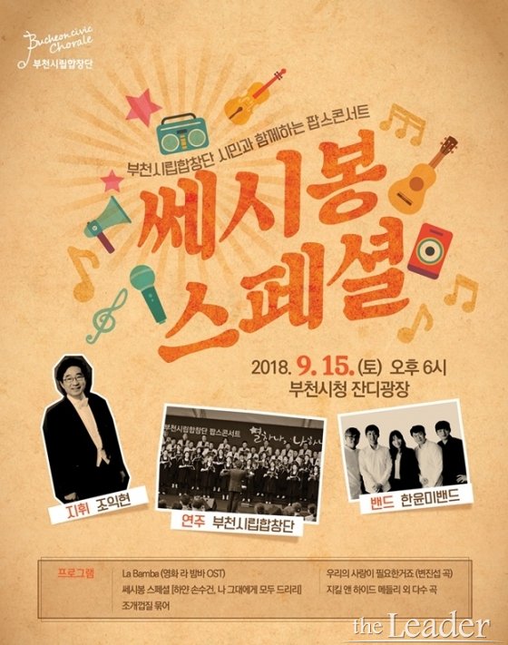 ¿ÃÇØ ºÎõ½Ã¸³ÇÕâ´ÜÀÇ ½Ã¹Î°ú ÇÔ²²ÇÏ´Â ÆË½ºÄܼƮ <½ê½ÃºÀ ½ºÆä¼È>Àº 2018³â 9¿ù 15ÀÏ Åä¿äÀÏ ¿ÀÈÄ 6½Ã, ºÎõ½Ãû Àܵð±¤Àå¿¡¼ °³ÃֵȴÙ. »óÀÓÁöÈÖÀÚ Á¶ÀÍÇöÀÇ ÁöÈÖ¿Í ºÎõ½Ã¸³ÇÕâ´ÜÀÇ ¿¬ÁÖ, ÇÑÀ±¹Ì ¹êµåÀÇ Çù¿¬À¸·Î ÇÔ²²ÇÏ´Â À̹ø °ø¿¬Àº 7080 À½¾Ç¿¡ Èì»¶ ºüÁú ¼ö ÀÖ´Â Ãß¾ïÀÇ ½Ã°£ÀÌ µÉ °ÍÀÌ´Ù.