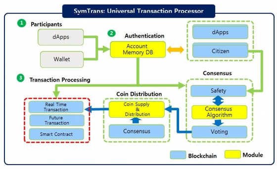 ¡®SymSensus¡¯´Â ÇÕÀǰúÁ¤À¸·Î °ÅºÎ±Ç(Veto)À» Æ÷ÇÔÇÑ ÅõÇ¥¹æ½ÄÀÇ BFT(Byzantine Fault Tolerant)¸¦ »ç¿ëÇÏ´Â °¡Àå ºü¸¥ BFT¾Ë°í¸®ÁòÀÌ´Ù. ¡®SymChain¡¯Àº ¿©·¯ °³ÀÇ ºí·ÏüÀÎÀ¸·Î µ¥ÀÌÅͱ¸Á¶°¡ ºÐ»êµÇ¾î °³º°ÀûÀÎ µ¥ÀÌÅÍ ºí·ÏÀÇ »ý¼º½Ã°£ °£°ÝÀ» ´Ù¸£°Ô ÇÒ ¼ö ÀÖ°í ºü¸¥ °Ë»ö󸮼ӵµ¸¦ ±¸ÇöÇÑ´Ù. ¡®SymStack¡¯Àº ¼¼°è ÃÖÃÊÀÇ ºí·ÏüÀÎ ÀúÀå ¾ÐÃà±â¼úÀ» ÀÌ¿ëÇØ ÀÛ¾÷³ëµåÀÇ ¸ÞÀκí·Ï ¿ë·®À» Å©°Ô Àý¾àÇÒ ¼ö ÀÖ´Ù. ¡®SymTrans¡¯´Â ½º¸¶Æ®°è¾àÀÌ ÇÊ¿ä ¾ø´Â ¹ü¿ë°Å·¡Ã³¸®±â·Î ±×µ¿¾È ºí·ÏüÀÎ Á¢±ÙÀÌ Èûµé¾ú´ø °³ÀÎ, ¼Ò»ó°øÀÎ ¹× ÀÎÅÍ³Ý ¾ÖÇø®ÄÉÀ̼ǿ¡°Ô »õ·Î¿î ºí·ÏüÀΠȰ¿ë ±âȸ¸¦ Á¦°øÇÑ´Ù.