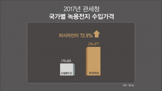 Áö³ÇØ °ü¼¼Ã»ÀÇ '³ª¶óº° ³ì¿ë ¼öÀÔ °¡°Ý' ÀÚ·á¿¡¼µµ ·¯½Ã¾Æ»ê ³ì¿ëÀÌ ´ºÁú·£µå»ê ³ì¿ë ´ëºñ Kg´ç ¾à 72.9% ÀÌ»ó ³ôÀº °ÍÀ¸·Î È®ÀÎµÈ ¹Ù ÀÖ´Ù.