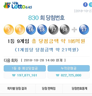 ·Î¶Ç 830ȸ ´ç÷¹øÈ£´Â '5, 6, 16, 18, 37, 38'ÀÌ´Ù. 2µî º¸³Ê½º ¹øÈ£´Â '17'ÀÌ´Ù.