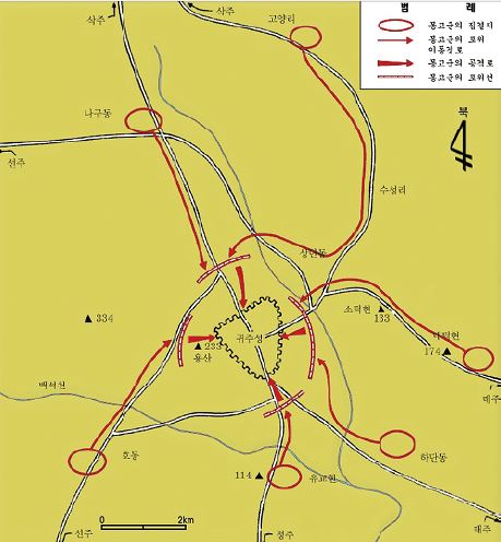 ¸ù°ñ±ºÀÌ °ø°ÝÀ» °¨ÇàÇØ¿ÀÀÚ, ¹Ú¼´Â ±º»ç¸¦ 3¹æ¸éÀ¸·Î ³ª´©¾î ±èÁß¿ÂÀ¸·Î ÇÏ¿©±Ý ¼ºÀÇ µ¿ÆíÀ», ±è°æ¼ÕÀ¸·Î ÇÏ¿©±Ý ¼ºÀÇ ³²¸éÀ» ¹æ¾îÇÏ°Ô Çϰí, ÀÚ½ÅÀº Á÷Á¢ ºÏ¹® ¼öºñ¸¦ ÁöÈÖÇß´Ù. ¸ù°ñÀÌ Á¤¿¹ ±âº´ 300¸íÀ¸·Î ºÏ¹®À» °ø°ÝÇØ¿ÀÀÚ, ¹Ú¼´Â Áï½Ã À̵éÀ» °ÝÅðÇß´Ù.