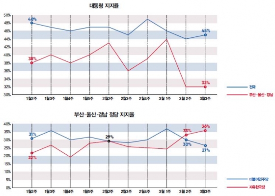 ´õºÒ¾î¹ÎÁÖ´çÀÌ ºÎ»êÀ¸·Î ´Þ·Á°¬´Ù. ¹ÎÁÖ´çÀº Áö³´Þ 13ÀÏ ¿¹»êÁ¤Ã¥ÇùÀÇȸ¸¦ ºÎ»ê¿¡¼ ¿¾ú´Ù. ¹ÎÁÖ´çÀº ¿ÃÇØ µÎ ¹øÀ̳ª PK¸¦ ã¾Ò´Ù. ¹®ÀçÀÎ ´ëÅë·Éµµ Áö³ 2¿ù ºÎ»êÀ» ¹æ¹®, ¡®ºÎ»ê ´ë°³Á¶ ÇÁ·ÎÁ§Æ®¡¯¿¡ ´ëÇÑ Áö¿øÀ» ¾à¼ÓÇÑ ¹Ù ÀÖ´Ù. À̵éÀÌ PK·Î °£ °ÍÀº Èçµé¸®´Â ¹Î½ÉÀ» Àâ±â À§Çؼ´Ù. Çѱ¹°¶·´ÀÌ ¹ßÇ¥ÇÑ Á¤´ç ÁöÁöÀ²¿¡ µû¸£¸é 3¿ù Àü±îÁö PKÁö¿ªÀº ¹ÎÁÖ´çÀÌ ÀÚÀ¯Çѱ¹´çº¸´Ù ³ô¾Ò´Ù. ±×·¯³ª 2¿ù 2ÁÖ¿¡´Â 29%·Î °°Àº ÁöÁöÀ²À» ±â·ÏÇÏ´Ù°¡ 3¿ù 2ÁÖ¿¡´Â Çѱ¹´çÀÌ 33%, ¹ÎÁÖ´çÀÌ 30%·Î ¿ªÀüµÆ´Ù. Áö³´Þ 22ÀÏ ¹ßÇ¥ÇÑ ÀÚ·á¿¡ µû¸£¸é ¹ÎÁÖ´çÀº 27%,Çѱ¹´çÀº 36%·Î ±× °ÝÂ÷´Â ´õ¿í ¹ú¾îÁ³´Ù. 20´ë ÃѼ± ºÎ¡¤¿ï¡¤°æ(ºÎ»ê¡¤¿ï»ê¡¤°æ³²)¿¡¼ ¹ÎÁÖ´ç ÀÇ¿ø 12¸íÀ», Áö³ÇØ Áö¹æ¼±°Å¿¡¼ ¿À°Åµ· ºÎ»ê½ÃÀå, ¼Ûöȣ ¿ï»ê½ÃÀå, ±è°æ¼ö °æ³²µµÁö»ç¸¦ ¹èÃâÇÑ °ÍÀ» ¶°¿Ã¸®¸é ¹Î½ÉÀÇ º¯È´Â ±Ø¸íÇÏ´Ù. ƯÈ÷ ´ëÅë·É ÁöÁöÀ² ÀÌÅ»À» ÀÏÄ´ ÀÌ¡¤¿µ¡¤ÀÚ(20´ë¡¤¿µ³²¡¤ÀÚ¿µ¾÷ÀÚ)¿¡µµ ¡®¿µ³²¡¯ÀÌ ¼ÓÇØ ÀÖ´Ù. Çѱ¹°¶·´ ´ëÅë·É ÁöÁöµµ¿¡ µû¸£¸é Àü±¹ ÁöÁöÀ²Àº 40%¸¦ ¿ôµµ´Â ¹Ý¸é PK´Â 30%´ë´Ù. ƯÈ÷ 3¿ù 3ÁÖ ±âÁØ, ´ëÅë·É ºÎÁ¤Æò°¡°¡ 62%¸¦ ±â·ÏÇß´Ù. ÀÌ´Â Àü±¹ ÃÖ°í ±â·ÏÀÌ´Ù. ¿©´ç¿¡°Ôµµ, ¾ß´ç¿¡°Ôµµ Áß¿äÇÑ Áö¿ªÀÎ PKÁö¿ªÀº ´ÙÀ½ ÃѼ±¿¡¼ ´©±¸ÀÇ ¼ÕÀ» µé¾îÁÙ±î.