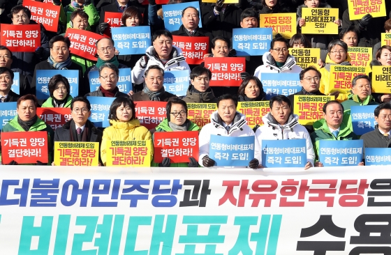 ¹Ù¸¥¹Ì·¡´ç°ú ¹ÎÁÖÆòÈ´ç, Á¤ÀÇ´ç, ¹ÎÁß´ç µî ¾ß´çÀÌ ¿ø¿ÜÁ¤´ç°ú ½Ã¹Î´Üüµé°ú ÇÔ²²¡®¿¬µ¿Çü ºñ·Ê´ëÇ¥Á¦¡¯ µµÀÔÀ» °í¸®·Î °øµ¿Àü¼±À» ±¸ÃàÇß½À´Ï´Ù. °Å´ë¾ç´ç, ¹ÎÁÖ´ç°ú Çѱ¹´çÀÌ ¼Ò±ØÀûÀÌÀÚ ¾Ð¹Ú¿¡ ³ª¼± °ÍÀÔ´Ï´Ù.
