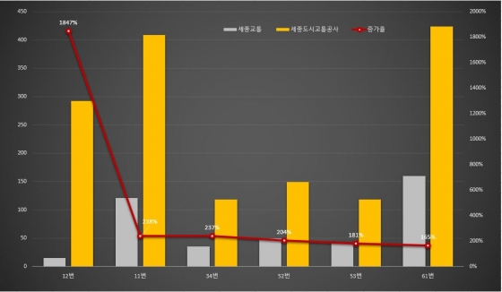 ¹Ý¸é, À̿밴ÀÌ ÁÙ¾îµç 67¹ø (¼¼Á¾Å͹̳Î~ºÎ¿ë2¸®)ÀÇ °æ¿ì¿¡´Â ºÎ¿ë¸® ÁÖº¯Áö¿ª µµ½Ã°³¹ß¿¡ µû¸¥ ÁֹΠ°¨¼Ò·Î, 82¹ø(ÀüÀǸé~´Ù¹æ¸®)ÀÇ °æ¿ì¿¡´Â ´ëü³ë¼± 86¹ø ½Å¼³·Î, 95¹ø(Á¶Ä¡¿ø~¼Û¼º3¸®)ÀÇ °æ¿ì¿¡´Â 81¹ø ³ë¼±À¸·Î ¼ö¿ä°¡ À̵¿ÇÏ¿© À̿밴ÀÌ °¨¼ÒÇÑ °ÍÀ¸·Î ³ªÅ¸³µ´Ù.