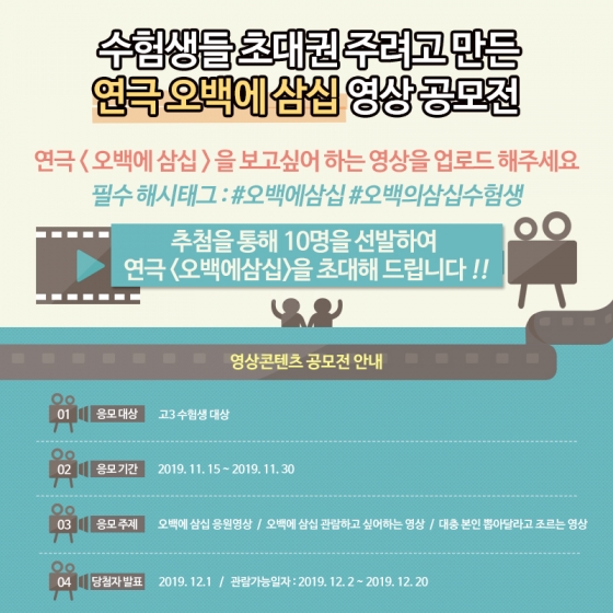 ¿¬±Ø ¿À¹é¿¡»ï½ÊÀº ¿À´Â 11¿ù 14ÀÏ ¼ö´ÉÀ» ¸¶Ä£ °í3 ¼öÇè»ýµé¿¡°Ô Ưº°ÇÑ Ãß¾ïÀ» Á¦°øÇϱâ À§ÇÑ ¿µ»ó °ø¸ðÀü À̺¥Æ® ¼Ò½ÄÀ» ÀüÇß´Ù. ÇÔ²² 1³âµ¿¾È °í»ýÇÑ ¹Ý Ä£±¸µé°ú ¿¬±Øµµ º¸°í 10´ëÀÇ ¸¶Áö¸· Ãß¾ïÀ» ½×À» ¼ö ÀÖ´Â ½Ã°£À¸·Î ¸¶·ÃµÈ À̹ø À̺¥Æ®´Â ¼öÇè»ýÀ̶ó¸é ´©±¸³ª ÀνºÅ¸±×·¥À» ÅëÇØ Âü¿©°¡ °¡´ÉÇÏ´Ù.