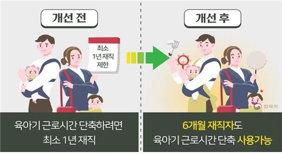 ÀÌ ³¯ ¹ßÇ¥¿¡´Â ±âÁ¸¿¡´Â À°¾Æ±â ±Ù·Î½Ã°£ ´ÜÃàÀ» ½ÅûÇϱâ À§ÇØ ÃÖ¼Ò 1³âÀÇ ÀçÁ÷±â°£ÀÌ ÇÊ¿äÇß¾úÁö¸¸ ±Ù¼Ó±â°£ 6°³¿ù ÀÌ»ó, 1³â ¹Ì¸¸ÀÎ »ç¶÷¿¡°Ôµµ À°¾Æ±â ±Ù·Î½Ã°£ ´ÜÃàÀ» ½ÅûÇÒ ¼ö ÀÖµµ·Ï Á¤ºñµÉ ¼ö ÀÖÀ» °ÍÀ¸·Î Àü¸ÁµÆ´Ù.