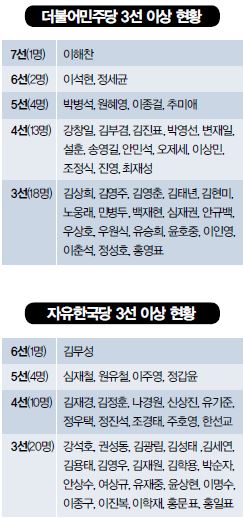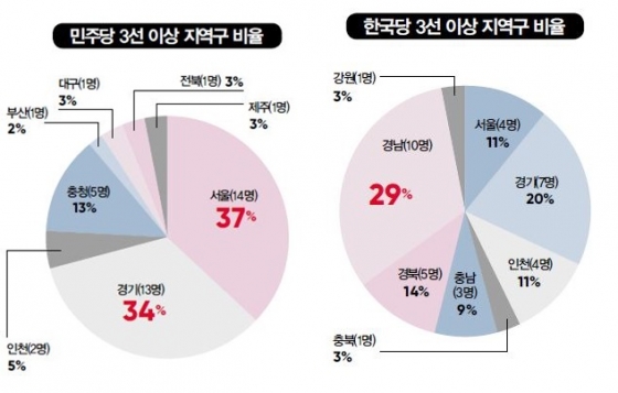 °¢ Á¤´ç¸¶´Ù ¡®3¼± ¿ëÅð·Ð¡¯ÀÌ ºÒ°í ÀÖ´Ù. ³»¿ëÀº ´Ù¸£´Ù. ¿ì¼± Áý±Ç ¿©´çÀÎ ¹ÎÁÖ´çÀÇ °æ¿ì ¡®¼öµµ±Ç ÁßÁøÀÇ¿ø¡¯¿¡°Ô ½Ã¼±ÀÌ ½ò¸°´Ù. ¹ÎÁÖ´çÀÇ 3¼± ÀÌ»ó ÀÇ¿øÀº ÃÑ 38¸íÀÌ´Ù. À̵é Áß ¼¿ïÀº 14¸í(36%), °æ±â´Â 13¸í(36%) ÀÎõÀº 2¸í(5%)´Ù. 3¼± ÀÌ»ó ÀÇ¿ø Áß 76%°¡ ¼¿ï¡¤°æ±â¡¤ÀÎõ¿¡ ¸ô·Á ÀÖ´Â °ÍÀÌ´Ù. ¼öµµ±Ç ±¹È¸ÀÇ¿ø Á¤¼ö°¡ ¸¹´Ù°í ÇÏ´õ¶óµµ Çѱ¹´ç 3¼± ÀÌ»ó ¼öµµ±Ç ÀÇ¿ø ºñÀ²(42%)¿¡ ºñÇÏ¸é ³ôÀº ¼öÁØÀÌ´Ù. ¹ÎÁÖ´ç 3¼± ÀÌ»ó ÀÇ¿øÀº ÃæÃ»¿¡ 5¸í(13%), ´ë±¸¿Í ºÎ»ê, ÀüºÏ, Á¦ÁÖ¿¡ °¢°¢ ÇÑ ¸í¾¿ ÀÖ´Ù.