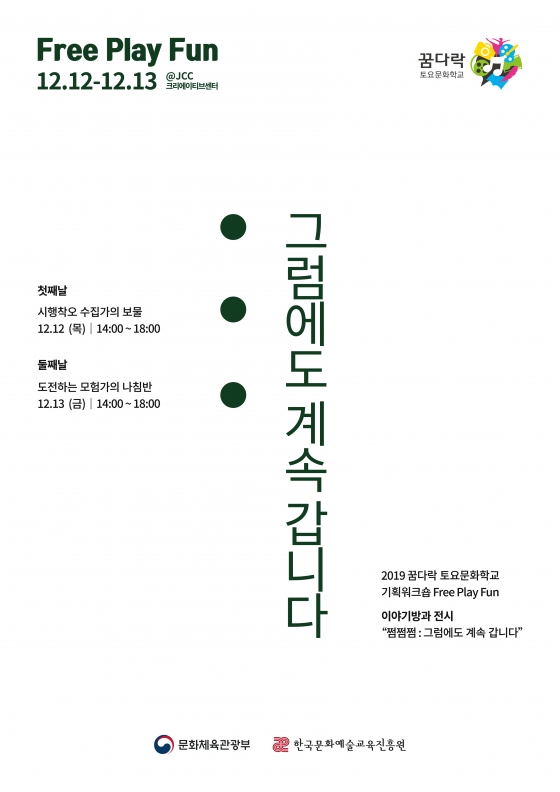 ¹®ÈüÀ°°ü±¤ºÎ(Àå°ü ¹Ú¾ç¿ì)¿Í Çѱ¹¹®È¿¹¼ú±³À°ÁøÈï¿ø(¿øÀå À̱Լ®, ÀÌÇÏ ±³À°ÁøÈï¿ø)Àº ¿À´Â 12¿ù 12ÀÏ(¸ñ), 13ÀÏ(±Ý) ¾çÀÏ °£ ¼¿ï ´ëÇзΠJCCÅ©¸®¿¡ÀÌÆ¼ºê¼¾ÅÍ¿¡¼ <²Þ´Ù¶ô Åä¿ä¹®ÈÇб³ ±âȹ¿öÅ©¼ó Free Play Fun> Çà»ç¸¦ °³ÃÖÇÑ´Ù.