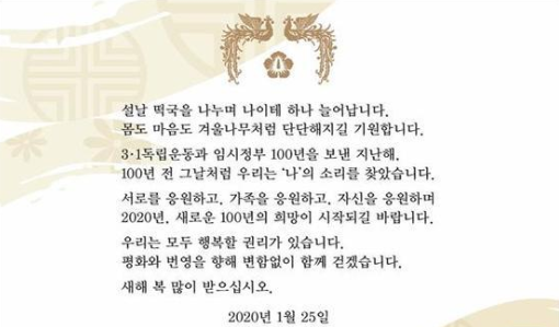 ¹® ´ëÅë·É ³»¿Ü´Â ¼±¹°°ú ´õºÒ¾î "3¡¤1µ¶¸³¿îµ¿°ú ÀÓ½ÃÁ¤ºÎ 100³âÀ» º¸³½ Áö³ÇØ, 100³â Àü ±×³¯Ã³·³ ¿ì¸®´Â '³ª'ÀÇ ¼Ò¸®¸¦ ã¾Ò´Ù"¸ç "¼·Î¸¦ ÀÀ¿øÇϰí, °¡Á·À» ÀÀ¿øÇϰí, ÀÚ½ÅÀ» ÀÀ¿øÇϸç 2020³â, »õ·Î¿î 100³âÀÇ Èñ¸ÁÀÌ ½ÃÀÛµÇ±æ ¹Ù¶õ´Ù"´Â ¸Þ½ÃÁö¸¦ ÇÔ²² µ¿ºÀÇß´Ù.