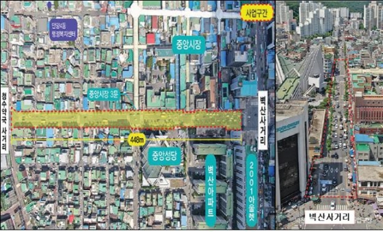 Àå³»·Î °³¼±±¸°£Àº º®»ê»ç°Å¸®ºÎÅÍ Ã»¼ö¾à±¹ ¾Õ¿¡ ±îÁö 450m´Ù.