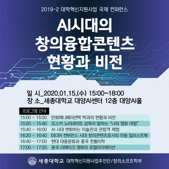¼¼Á¾´ë ¹®Çö¼± ±³¼öÀÇ »çȸ·Î ÁøÇàµÇ´Â À̹ø ÄÁÆÛ·±½º¿¡¼ ¼¼Á¾´ë ¸¸È¾Ö´Ï¸ÞÀ̼ÇÅØ °À±±Ø ±³¼ö´Â ¡®¼¼Á¾´ë ¸¸È¾Ö´Ï¸ÞÀÌ¼Ç µðÁöÅÐÄÜÅÙÃ÷ÅØ Àü°ø ¼Ò°³¡¯¶ó´Â Á¦¸ñÀ¸·Î VFX, 3D Animation, AR, VR µîÀÇ À¶ÇÕÄÜÅÙÃ÷ÀÇ ´ëÇ¥ÀûÀÎ »ç·Ê¸¦ ¹ßÇ¥ÇÑ´Ù.