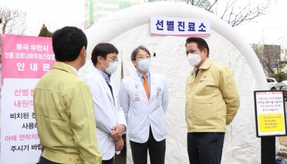 ÃÖ ½ÃÀåÀº ¸¶½ºÅ©¸¦ Âø¿ëÇÑ Ã¤ ÇѸ²´ëº´¿ø°ú »ùº´¿øÀ» ã¾Æ À½¾Ðº´»ó°ú ¿È»ó Ä«¸Þ¶ó µî Àü¿°º´ ¿¹¹æ¿¡ µû¸¥ ½Ã¼³À» µÑ·¯º¸¸ç ÀÇ·áÁøµéÀ» °Ý·ÁÇß´Ù.