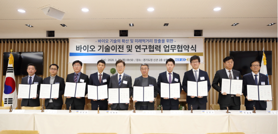 ÀÌÀç¸í °æ±âµµÁö»ç¿Í ±è±âÁØ °æÁ¦°úÇÐÁøÈï¿øÀå, µµ³» ¹ÙÀÌ¿À ±â¾÷(³ëÅ彺Å×¶óÇÇ¡¤´ÙÀº¸ÞµðÄ®¡¤¾ËÆÄ¹ÙÀÌ¿À¡¤¿¡½º¾ÆÀ̹ÙÀÌ¿À¡¤¿ÂÄÚºò½º¡¤ÄÚÆÊ¡¤Æ¼ÀÌ¿£¡¤Ç»Á¨¹ÙÀÌ¿À) ´ëÇ¥ 8¸íÀº 30ÀÏ °æ±âµµÃ» »óȲ½Ç¿¡¼ ¡®¹ÙÀÌ¿À ±â¼úÀÌÀü ¹× ¿¬±¸Çù·ÂÀ» À§ÇÑ ¾÷¹«Çù¾à¡¯À» ü°áÇß´Ù.