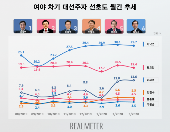 31ÀÏ ¿©·ÐÁ¶»ç±â°ü ¸®¾ó¹ÌÅÍ¿¡ µû¸£¸é ¸®¾ó¹ÌÅͰ¡ ¿À¸¶ÀÌ´º½º ÀÇ·Ú·Î ½Ç½ÃÇÑ '3¿ù Â÷±â ´ë¼±ÁÖÀÚ ¼±È£µµ'(95% ½Å·Ú¼öÁØ¿¡ Ç¥º»¿ÀÂ÷ ¡¾1.9%p)Á¶»ç °á°ú ÀÌ Àü ÃѸ®´Â Àü´Þ¿¡ ºñÇØ 0.4%p Ç϶ôÇÑ 29.7%·Î Áý°èµÆ´Ù. ¼ÒÆø Ç϶ôÇßÁö¸¸ 4°³¿ù ¿¬¼Ó 30% ¾ÈÆÆÀÇ ÁöÁöÀ²·Î 10°³¿ù ¿¬¼Ó 1À§¸¦ À̾´Ù.