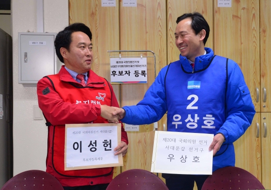 ¡ãÁö³­ 20´ë ±¹È¸ÀÇ¿ø ¼±°Å Èĺ¸ÀÚ µî·Ï ¶§ ¼­¿ï ¼­´ë¹®±¸ ¼±°Å°ü¸®À§¿øÈ¸¿¡¼­ ´ç½Ã »õ´©¸®´ç À̼ºÇå Èĺ¸¿Í ´õºÒ¾î¹ÎÁÖ´ç ¿ì»óÈ£ È帰¡ µî·ÏÀ» ¸¶Ä£ ÈÄ ¾Ç¼ö¸¦ ³ª´©°í ÀÖ´Ù./»çÁø=¸Ó´ÏÅõµ¥ÀÌ
