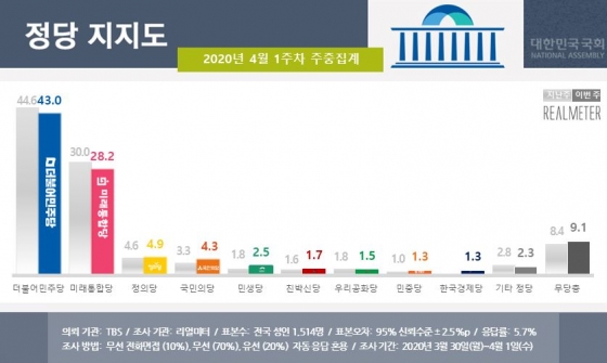 ¹ÎÁÖ´ç µÚ¸¦ ¹Ì·¡ÅëÇÕ´çÀÌ 28.2%(1.8%p¡é), Á¤ÀÇ´çÀÌ 4.9%(0.3%p¡è), ±¹¹ÎÀÇ´çÀÌ 4.3%(1.0%p¡è), ¹Î»ý´çÀÌ 2.5%(0.7%p¡è), Ä£¹Ú½Å´çÀÌ 1.7%(0.1%p¡è), ¿ì¸®°øÈ´çÀÌ 1.5%(0.3%p¡é), ¹ÎÁß´çÀÌ 1.3%(0.3%p¡è), Çѱ¹°æÁ¦´çÀÌ 1.3%(-)¸¦ ±â·ÏÇÏ¸ç µû¶ú´Ù. ¹«´çÃþÀº 9.1%·Î Áö³ÁÖ ´ëºñ 0.7%p ¿Ã¶ú´Ù.