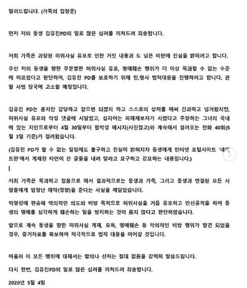 ÀÌ¿Í ÇÔ²² °ø°³ÇÑ °¡Á· ÀÔÀå¹®¿¡µµ ¡°µ¿»ý(±è PD)À» ÇâÇÑ ¹«ºÐº°ÇÑ ÇãÀ§»ç½Ç À¯Æ÷, ¸í¿¹ÈÑ¼Õ ÇàÀ§°¡ ´õÀÌ»ó ¹¬°úÇÒ ¼ö ¾ø´Â ¼öÁØ¿¡ À̸£·¶´Ù°í ÆÇ´Ü, ±è PD¸¦ º¸È£Çϱâ À§ÇØ ¹Î¡¤Çü»ç ¹ýÀû ´ëÀÀÀ» ÁøÇàÇÏ·Á°í ÇÑ´Ù. °üÇÒ »ç¹ý ´ç±¹¿¡ °í¼ÒÇÒ ¿¹Á¤¡±À̶ó°í Àû¾ú´Ù.