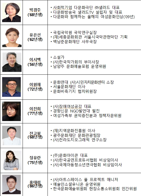 ½ÅÀÓ À§¿øµéÀº ¡ãÀ̽ùé(¼Ò¼³°¡) ¡ãÁ¤À¯¶õ(¹®È¾ÆÀÌÄÜ ´ëÇ¥) ¡ãÀ¯Àº¼±(Çѱ¹¿¹¼úÁ¾ÇÕÇб³ °»ç) ¡ãȫŸ²(¡®Å©¸®Æ½-Ä®¡¯ ¹ßÇàÀÎ) ¡ã¹Ú°æÁÖ(»ø·¯µå ´ëÇ¥), ¡ãÀÌ¿øÀç(½Ã¹ÎÀÚÄ¡¹®È¼¾ÅÍ ¼ÒÀå) ¡ãÀÌÁøÈñ(Àå¾Ö¿©¼º°ø°¨ ´ëÇ¥) ¡ãÀü°íÇÊ(Àü¶óµµÁö¿À±×·¡ÇÈ ¿¬±¸¼ÒÀå) µî ÃÑ 8¸íÀÌ´Ù