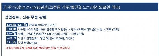 ÀÌ È®ÁøÀÚ´Â 5¿ù 16ÀÏ~17ÀÏ °æ±âµµ ±ºÆ÷¿¡ ¸Ó¹°·¶´Ù. ÀÌÈÄ 18ÀÏ ¼¼ö¿ø¹ö½ºÅ͹̳ο¡¼ ¿ÀÈÄ 7½Ã 15ºÐ¿¡ ÁøÁÖÇà ¹ö½º¿¡ ž½Â, ÁøÁֽÿܹö½ºÅ͹̳ο¡ ¹ã 11½Ã 10ºÐ¿¡ µµÂøÇß´Ù. ÀÌÈÄ ÀÚÂ÷·Î ÀÚÅÃÀ¸·Î À̵¿Çß´Ù.