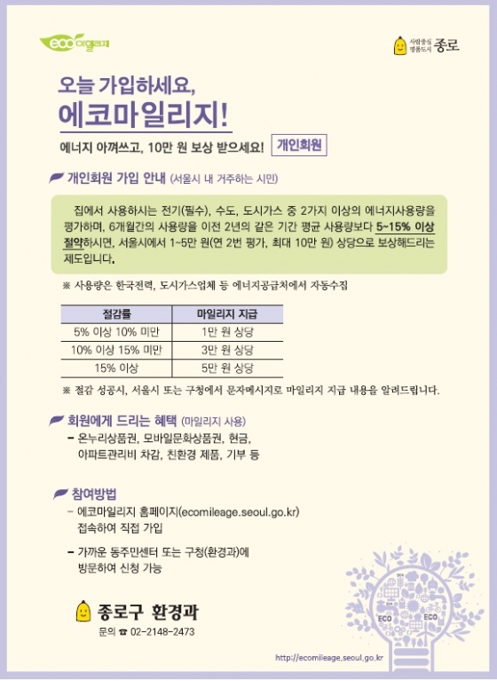¿¡ÄÚ¸¶Àϸ®Áö´Â ȸ¿ø °¡ÀÔ ÈÄ Àü±â, ¼öµµ, µµ½Ã°¡½ºÀÇ »ç¿ë·®À» 6°³¿ù ÁÖ±â·Î È®ÀÎÇØ ¿¡³ÊÁö Àý°¨À» ½ÇõÇÑ È¸¿ø¿¡°Ô Àý°¨·ü¿¡ µû¶ó ÃÖ´ë 5¸¸ ¸¶Àϸ®Áö¸¦ Á¦°øÇÏ´Â ÇÁ·Î±×·¥ÀÌ´Ù.