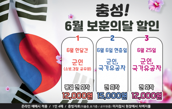 6¿ùÀº ³ª¶ó¸¦ À§ÇØ ¸ö°ú ¸¶À½À» ¹ÙÄ£ ¼ø±¹ ¼±¿µéÀÇ Èñ»ýÀ» ±â¸®±â À§ÇÑ ±¹°¡º¸ÈÆÃ³°¡ Á¤ÇÑ È£±¹º¸ÈÆÀÇ ´ÞÀÌ´Ù. ÀÌ¿¡ ¿¬±Ø ¿À¹é¿¡»ï½ÊÀº 6ÀÏ ÇöÃæÀϰú Çѱ¹ÀüÀïÀÌ ÀÖ¾ú´ø 25ÀÏÀº ¹°·Ð 6¿ù ÇÑ´Þ Àü ȸÂ÷ ÇÒÀÎÀ» ÁøÇàÇÑ´Ù. À̹ø ÇÒÀÎÀº ³ª¶óÀÇ ¾È³ç°ú ±¹¹ÎÀÇ °Ç°À» À§ÇØ ³ë·ÂÇÏ°í °è½Å ¼Ò¹æ, °æÂû°ø¹«¿ø, ±ºÀÎ, ±¹°¡À¯°øÀÚ µîÀÇ ºÐµéÀ» ´ë»óÀ¸·Î ÇÑ´Ù. ¿Â¶óÀÎ ¿¹¸Å·Î ÇÒÀÎ Àû¿ë °¡´ÉÇϸç ÇöÀå¿¡´Â ÁõºùÀÚ·áµéÀ» Çʼö ÁöÂüÇØ¾ß ÇÑ´Ù. ÀÚ¼¼ÇÑ »çÇ×Àº ÀÎÅÍÆÄÅ© ƼÄÏÀ» ÅëÇØ È®ÀÎÇÒ ¼ö ÀÖ´Ù.