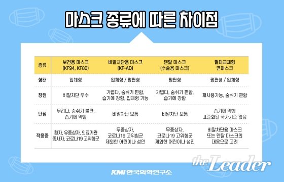 ÀÌ¾î ¡°ÇÊÅͱ³Ã¼Çü ¸é¸¶½ºÅ©ÀÇ °æ¿ì, ¾ÆÁ÷ Ç¥ÁØÈµÈ ±¹°¡ ±âÁØÀÌ ¾ø±â ¶§¹®¿¡ KF-AD ¸¶½ºÅ©³ª µ§Å» ¸¶½ºÅ©¸¦ Âø¿ëÇÒ ¼ö ÀÖ´Â »óȲ¿¡¼ ´ë¾ÈÀ¸·Î »ç¿ëÀ» °í·ÁÇÒ ¼ö ÀÖ´Ù. ÀÏ¹Ý ¸é¸¶½ºÅ©´Â ºñ¸» Â÷´Ü È¿°ú°¡ °ÅÀÇ ¾øÁö¸¸ Á¢ÃË °¨¿°À» ¿¹¹æÇÒ ¼ö Àֱ⠶§¹®¿¡ ¸¶½ºÅ©¸¦ ¾È ¾²´Â °Íº¸´Ù´Â ÀÏ¹Ý ¸é¸¶½ºÅ©¶óµµ ¾²´Â °ÍÀÌ ³´´Ù¡±¶ó°í µ¡ºÙ¿´´Ù.