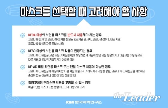 ½Å»ó¿± KMI ÇмúÀ§¿øÀå(°¨¿°³»°ú Àü¹®ÀÇ)Àº ¸¶½ºÅ©¸¦ ¼±ÅÃÇÒ ¶§ °í·ÁÇØ¾ß ÇÒ Á¡¿¡ ´ëÇØ ¡°Äڷγª19 ȯÀÚ ¹× ȯÀÚ¸¦ µ¹º¸´Â ÀÇ·á±â°ü Á¾»çÀÚ, Äڷγª19 Áõ»óÀÌ ³ªÅ¸³ »ç¶÷, Äڷγª19 ÀǽÉȯÀÚ¸¦ µ¹º¸´Â »ç¶÷Àº ¹Ýµå½Ã KF94 ÀÌ»óÀÇ º¸°Ç¿ë ¸¶½ºÅ©¸¦ Âø¿ëÇØ¾ß ÇÑ´Ù¡±¶ó°í ¸»Çß´Ù.