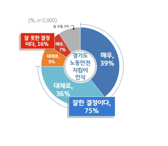 °æ±âµµ°¡ Áö³ 4¿ùºÎÅÍ ¿î¿µÇϱ⠽ÃÀÛÇÑ ¡®³ëµ¿¾ÈÀüÁöÅ´ÀÌ¡¯¿¡ ´ëÇØ¼´Â ´Ù¼ö(75%)ÀÇ µµ¹ÎÀÌ ¡®ÀßÇÑ °áÁ¤¡¯À̶ó°í ±àÁ¤ÀûÀ¸·Î Æò°¡Çß´Ù. °æ±âµµ ¡®³ëµ¿¾ÈÀüÁöÅ´ÀÌ¡¯´Â »ê¾÷¾ÈÀüº¸°Ç±âÁØ À§¹Ý, ¾ÈÀüÀçÇØ ¿¹¹æÁ¶Ä¡ À§¹Ý, ¾ÈÀü°ü¸®ÀÚ ¹èÄ¡ ¿©ºÎ µî¿¡ ´ëÇÑ Á¡°Ë Ȱµ¿À» Çϰí ÀÖÀ¸¸ç, 2020³âµµ´Â ½Ã¹üÀûÀ¸·Î »êÀç ´Ù¹ß 10°³ ½Ã¡¤±ºÀ» ´ë»óÀ¸·Î 10¸íÀÌ È°µ¿Çϰí ÀÖ´Ù.