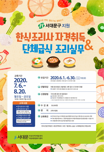 ±³À°Àº 7¿ù 6ÀϺÎÅÍ 8¿ù 25ÀϱîÁö ¿ù¿äÀϺÎÅÍ ±Ý¿äÀÏ 14½Ã~18½Ã¿¡ ÀÌ·ç¾îÁú ¿¹Á¤À̸ç, ÇѽÄÁ¶¸®»ç ÀÌ·Ð ¹× ½Ç±â, ´Üü±Þ½ÄÁ¶¸® ÀÌ·Ð ¹× ½Ç¹«¸¦ ÁßÁ¡À¸·Î ÁøÇàµÈ´Ù. ¼¼ºÎÀûÀ¸·Î Ä¥ÀýÆÇ, ³Êºñ¾Æ´Ï, È«ÇÕÃÊ, »ý¼±Âî°³ µî ÇѽÄÁ¶¸®±â´É»ç¿¡¼ ¿ä±¸ÇÏ´Â Àüü ½Ç±â ¸Þ´º¸¦ ¹è¿ì°í, ¾ç¼ÛÀÌÄ¡ÁîÁ×, °ËÀº±ú ¸®Á¶¶Ç ¿Ü 56°³ ¸Þ´ºÁ¶¸® ¹× ½Ç½À °úÁ¤µµ ÁøÇàÇÑ´Ù.