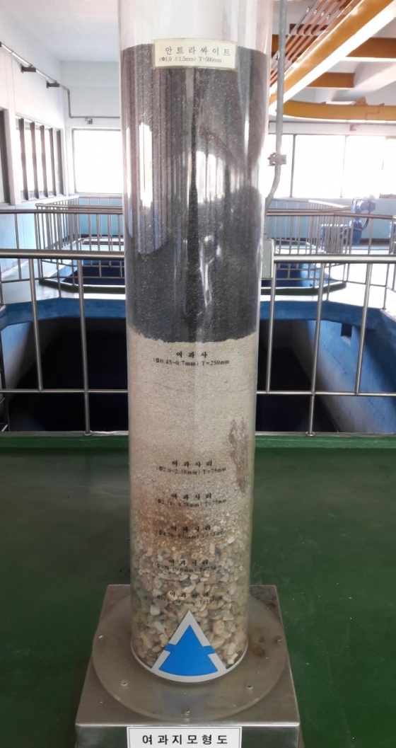 Ç¥ÁØÁ¤¼ö󸮰øÁ¤Àº ÆÈ´ç»ó¼ö¿øÀ¸·ÎºÎÅÍ µµÂøÇÏ´Â ¹°ÀÌ Âø¼öÁ¤, ÀÀÁýÁö, ħÀüÁö¸¦ °ÅÃÄ ¿©°úÁö¸¦ Åë°úÇÒ ¶§ ´ÙÃþ¿©°ú·Î °É·¯ÁÖ´Â ¹æ½ÄÀÌ´Ù. ´ÙÃþ¿©°ú´Â ¾ÈÆ®¶ó»çÀÌÆ®(¹«¿¬Åº), ¸ð·¡, ÀÚ°¥ µî 1.5m·Î ±¸¼ºµÅ ÀÖ´Ù.