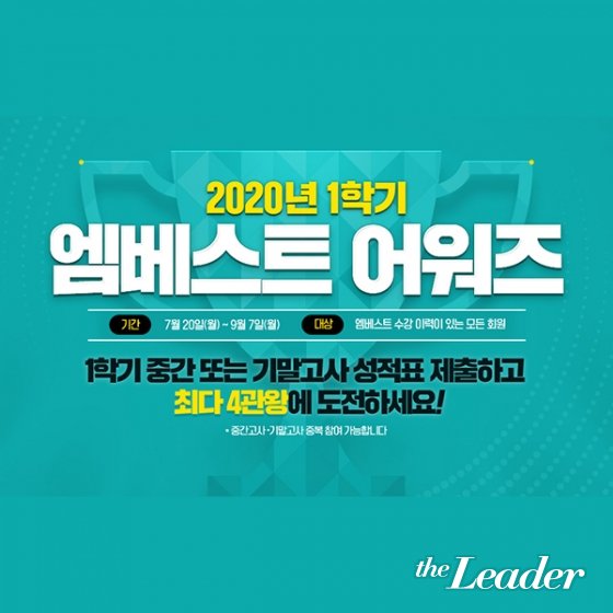 ¿¥º£½ºÆ® ¾î¿öÁî´Â 1Çбâ Áß°£°í»ç³ª ±â¸»°í»ç ¼ºÀûÇ¥¸¦ Á¦ÃâÇϸé Âü¿©ÇÒ ¼ö ÀÖ´Â À̺¥Æ®À̸ç, º£½ºÆ®»ó°ú ¼ºÀûÇâ»ó»óÀ¸·Î ³ª´©¾î ÁøÇàÇÑ´Ù. ¿ì¼± º£½ºÆ®»óÀº ÁÖ¿ä°ú¸ñ Æò±Õ 95Á¡ ÀÌ»óÀ̰ųª, ¿ä°ú¸ñ ¿Ã¹éÀΠȸ¿ø¿¡°Ô °¢°¢ ¿Â¶óÀÎ ¹®È»óǰ±Ç 5õ¿ø ±Ç°ú 1¸¸¿ø ±ÇÀÌ ÁÖ¾îÁø´Ù. ¼ºÀûÇâ»ó»óÀº Á÷Àü½ÃÇè ´ëºñ ÁÖ¿ä°ú¸ñ ±âÁØ Æò±Õ 10Á¡ ÀÌ»ó ¶Ç´Â ÇÑ °ú¸ñ 25Á¡ ÀÌ»ó Çâ»óÇÑ È¸¿øÀ» ´ë»óÀ¸·Î ÇÑ´Ù. »óǰÀº ¿Â¶óÀÎ ¹®È»óǰ±Ç 1¸¸¿ø ±ÇÀÌ´Ù.