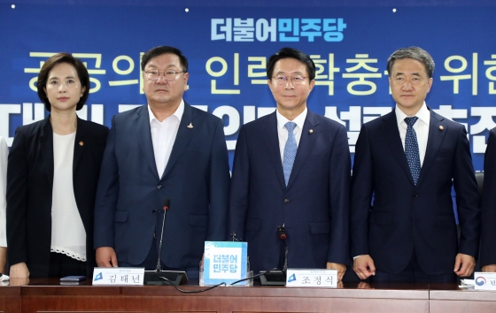 | ¡ãÀ¯ÀºÇý(¿ÞÂʺÎÅÍ) »çȸºÎÃѸ® °â ±³À°ºÎÀå°ü°ú ±èų⠹ÎÁÖ´ç ¿ø³»´ëÇ¥, Á¶Á¤½Ä Á¤Ã¥À§ÀÇÀå, ¹Ú´ÉÈÄ º¸°Çº¹ÁöºÎ Àå°üÀÌ 23ÀÏ ¿ÀÀü ¼¿ï ¿©Àǵµ ±¹È¸¿¡¼ ¿¸° ´õºÒ¾î¹ÎÁÖ´ç °ø°øÀÇ·á ÀÎ·Â È®ÃæÀ» À§ÇÑ ÀÇ´ëÁ¤¿ø È®´ë ¹× °ø°øÀÇ´ë ¼³¸³ ÃßÁø¹æ¾È ´çÁ¤ÇùÀÇ¿¡¼ »çÁøÃÔ¿µÀ» Çϰí ÀÖ´Ù. /»çÁø=´º½Ã½º |