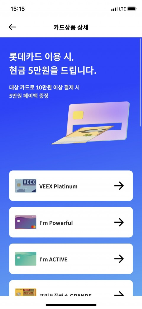 ¾Ë´Ù ¾Û¿¡¼ ¡âVEEX Platinum ¡âI¡¯m Powerful ¡âI¡¯m Active ¡âÆ÷ÀÎÆ®Ç÷¯½º Grande ¡âI¡¯m Wonderful Plus µî 5Á¾ÀÇ ·Ôµ¥Ä«µå¸¦ ½Å±Ô ¹ß±Þ¹ÞÀº µÚ 10¸¸¿ø ÀÌ»ó °áÁ¦ÇÏ¸é ´ÙÀ½ ´Þ¿¡ ij½Ã¹éÀ» ¹ÞÀ» ¼ö ÀÖ´Ù.